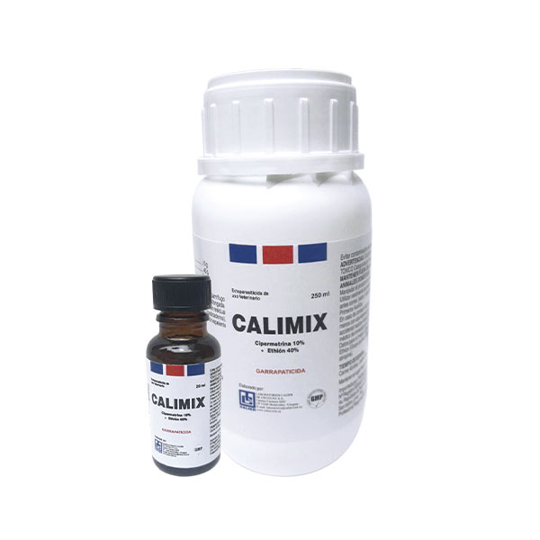 CALIMIX concentrado emulsionable, se utiliza en baños de inmersión y aspersión para el control de moscas, garrapatas, piojos y ácaros de la sarna en bovinos.